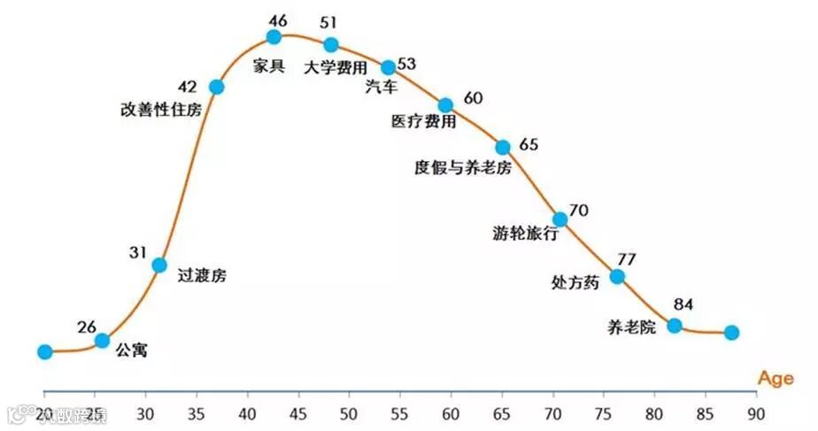 从实证的数据看,人口与消费呈现出“46岁”现象。人口学统计显示,典型的家庭消费高潮一般出现在家庭中的抚养人46岁的时候,此后孩子们纷纷离开父母,独自生活。美国劳工统计局的消费支出调查根据年龄段划分,对600多项消费支出测评,结果显示支出确实随年龄变化而变化,大部分家庭在父母46岁时达到支出高峰(经济条件较好的家庭,这一峰值出现得较晚),人们在54岁时达到储蓄高峰,在64岁时拥有最多净资产(图表3)。