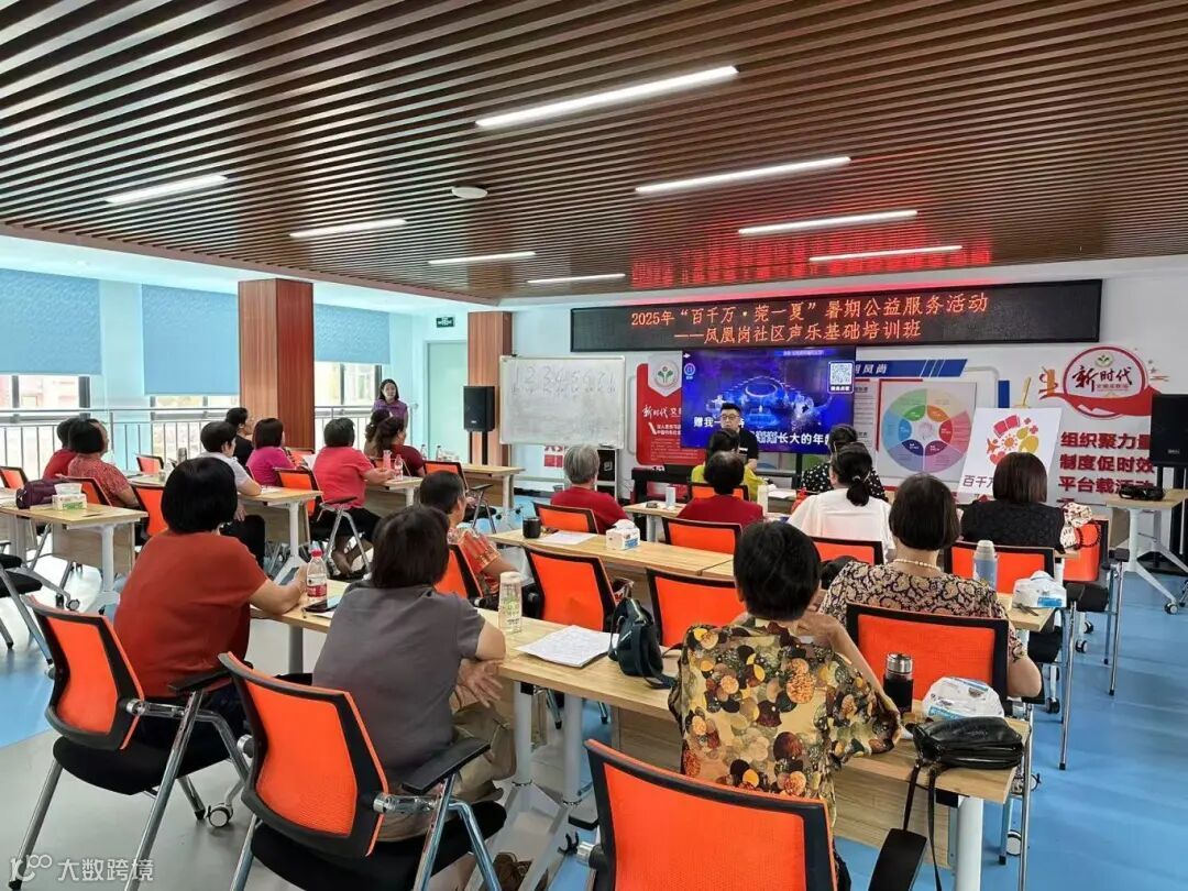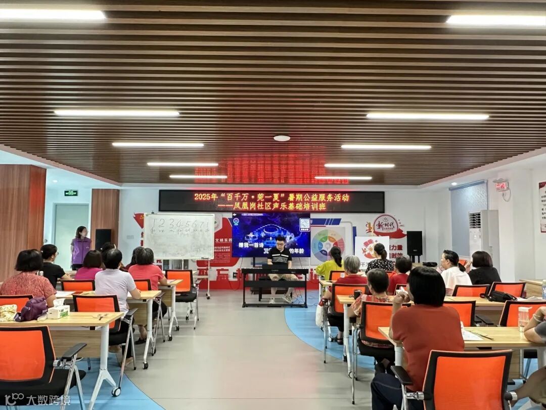 为丰富社区居民的精神文化生活,提升居民的艺术修养与歌唱能力,链接社会力量,凤凰岗社区与东莞市电子科技学校组成结对关系,于2025年5月至7月,开展了为期 6 节的凤凰岗社区“百千万·莞一夏”主题公益服务活动—声乐基础培训,吸引了30余名居民踊跃参与。由东莞市电子科技学校专业声乐老师王晓亮担任这次培训的授课老师,为居民们带来了一场既专业又接地气的音乐之旅。