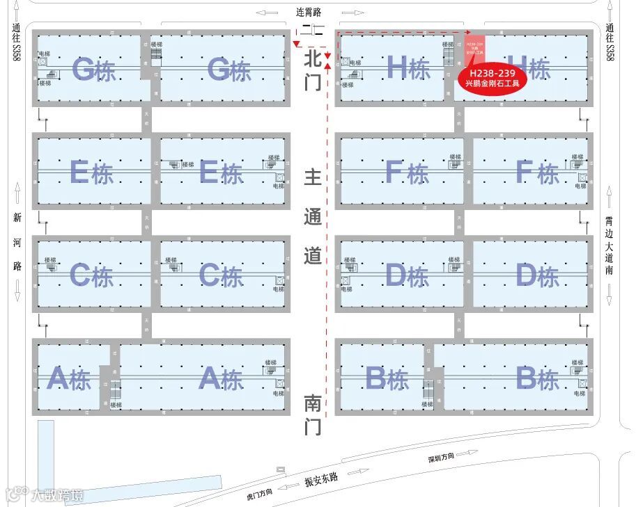 兴鹏金刚石工具莞深店,从莞深商贸城北门进主通道至H栋电梯处,直上二楼出电梯左转拐角直行至H238即是。