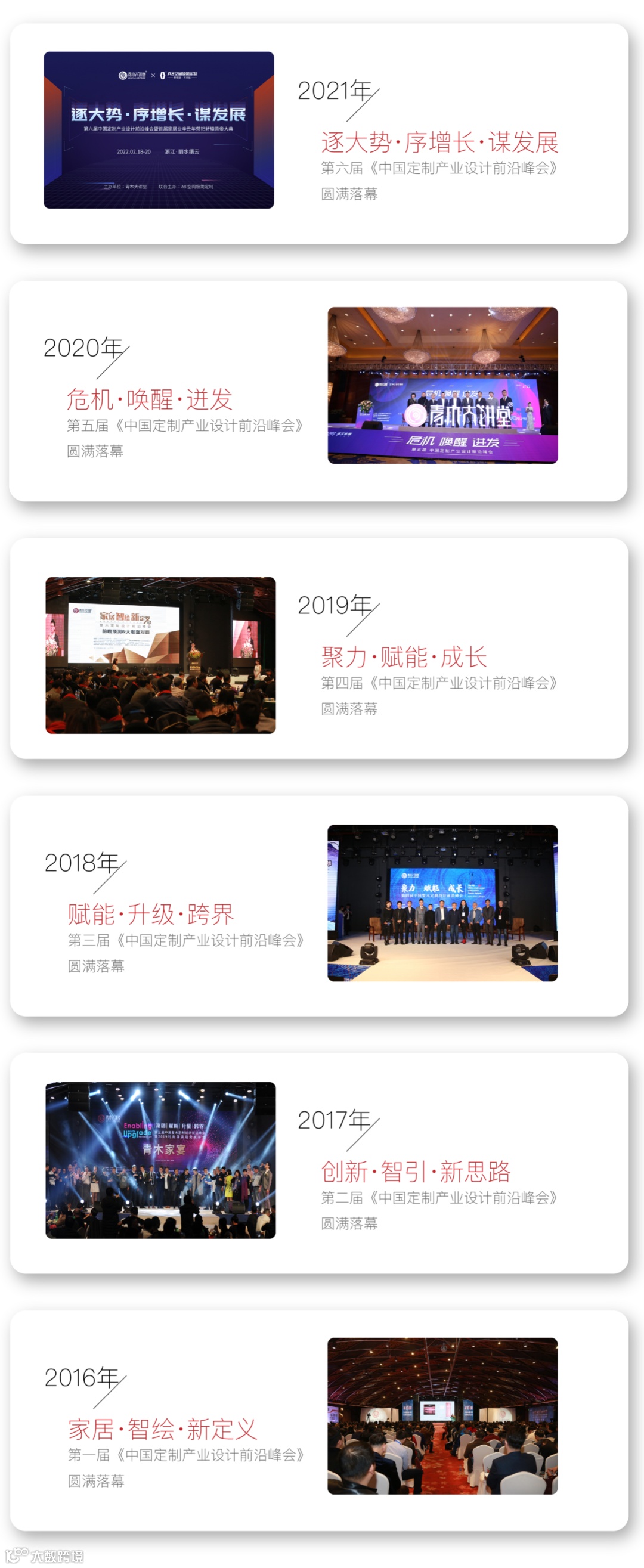 从第一届“预见设计,探讨未来”为思辨核心的开场到2022年初的“逐大势•序增长•谋发展”,以推动高端定制行业发展,探寻末来出路为核心内容的《峰会》,从2016年至今已在全国范围内成功举办六届。