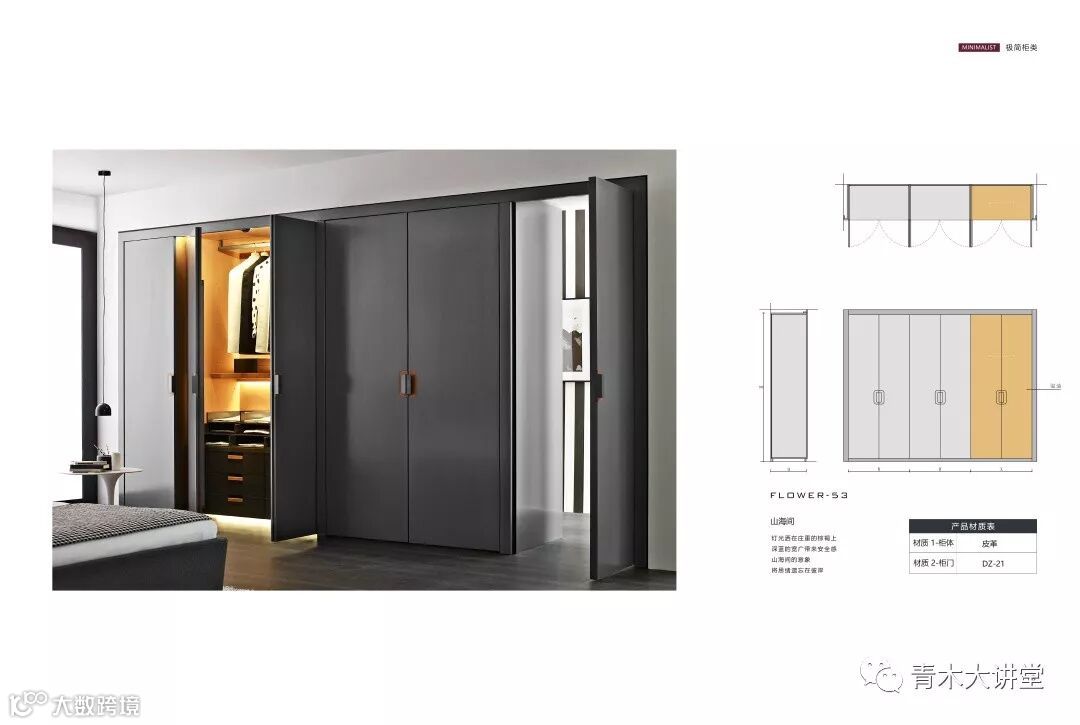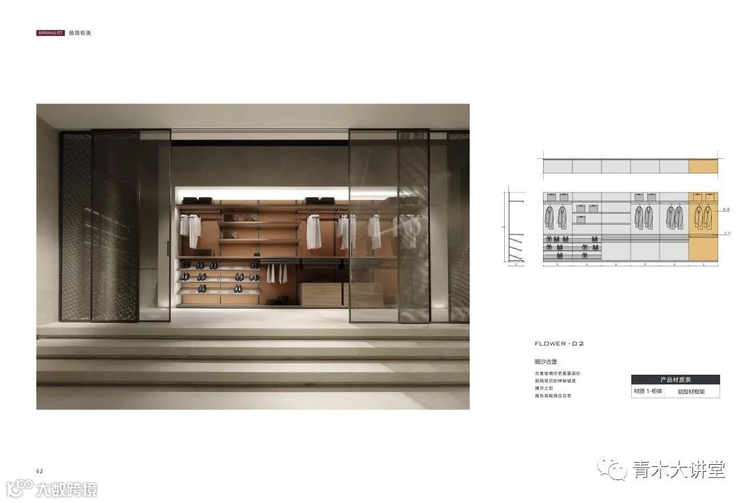 有了设计,自然不能缺少材料供应以来生产。《极简柜类》除了包含柜体所需的大板材质信息外,还包括柜类涉及的玻璃门柜系统、皮革收纳系统、智能五金配件等一应所需的材料供应商信息。