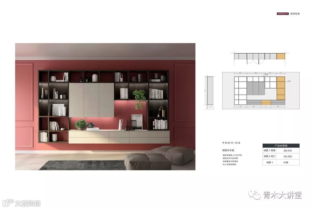 《极简柜类应用方案》,是继《极简木饰面》和《极简房门》之后的第三套极简案例。全书含近百款精心设计的案例,包括书柜、电视柜、衣柜三种柜类,每套案例皆包括产品CAD图、产品文化以及材质信息。