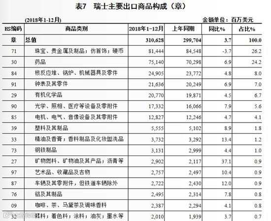 同时,我们从表格中还可以看到,2018年,钟表出口只占瑞士出口总额的7%,这说明瑞士可不单单是“钟表王国”。