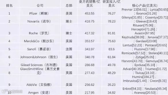 罗氏制药是瑞士第一大药企,它的竞争对象是美国辉瑞,它们常年抢夺谁是世界第一大制药企业的宝座。罗氏在抗肿瘤药方面处于霸主地位。研制的“奥司他韦”,被公认为是唯一一种对禽流感、甲流等严重疫情有显著疗效的药物。诺华研发的格列卫,创造了526亿美元的销售额,即便过了专利期,2017年仍有19.4亿美元的销售额。