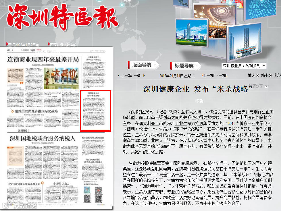 深圳特区报讯(记者 杨勇)互联网大潮下,快速发展的膳食营养补充剂行业正面临转型,而品牌商与渠道商之间的关系也变得更加微妙。日前,在中国医药物资协会主办、在澳大利亚上市的深圳企业生命力控股集团协办的“2015大健康产业电子商务(西湖)论坛”上,生命力发布“米杀战略”:在与消费者沟通的“最后一米”关键位置,生命力将以强势的品牌扩张,给予医药连锁店更大利润空间和激励政策,与渠道商并肩转型。业内人士认为,在品牌商欲转型电商甚至“去连锁化”的背景下,生命力此举无疑是给渠道商吃下一颗定心丸,有望带动膳补剂行业走出一条“渐进、并轨、共赢”的进化之路。