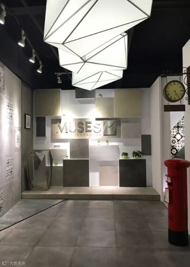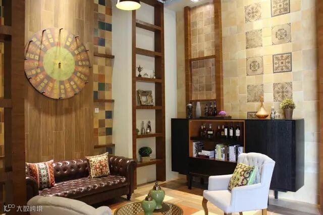 展厅的空间色彩在和谐中对比,腰线与主砖色彩的对比,或者是小色块与主色调的对比,再配以细节的点缀,凸显意式美学瓷砖厚重独特的味道。采用混搭设计手法,更色彩丰富、活跃,符合现代仿古砖的产品定位。
