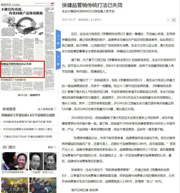 近日,由生命力冠名的《带着爸妈去旅行》最后一集播出,节目暖心收官。在传统保健品领域,通过冠名营销的很少,品牌商往往强化对产品功效的直接宣传,如此前的三株口服液、蚁力神等,以洗脑式的广告投放吸引消费。生命力之所以这么做,澳大利亚生命力控股集团董事会主席陈良超的解释是:保健品行业的传统打法已经失效。