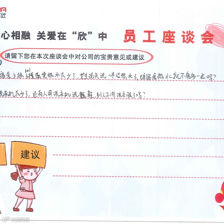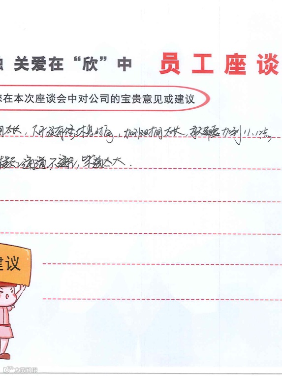 在大家纷纷踊跃发言时,人资也记录着各位的问题点。同时行政安全以及业务部门的同事也在现场为大家给予答复,对于无法现场处理的事情也通过不记名的形式记录在册,会在最快的时间进行跟进,并给出解决方案。整场座谈会共计收集了20余条意见反馈,人力资源部将会把收集到的每一条问题点反馈至责任部门并进行改进,最终将改善结果通过各车间部门公示栏反馈至员工。
