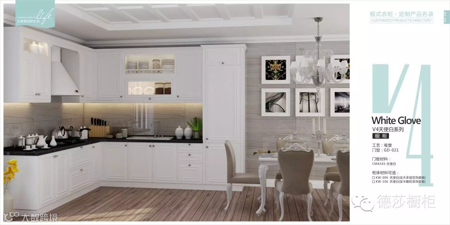 天使白系列:白色的厨房柜面,白色的储物柜,表面带点雕刻精巧的雕花,配合整个厨房,带来一股浓浓的法式浪漫清新感觉。