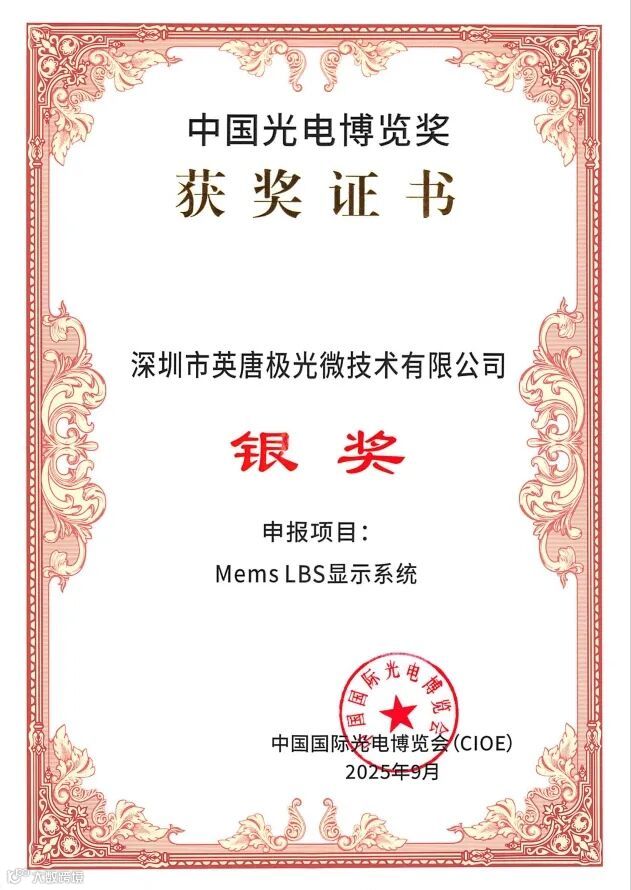 此次参展中,英唐极光微还带来了车载显示技术的重大突破——自主研发的“MEMS LBS显示系统”。在奖项答辩过程中获得众多专家院士的一致好评,一举荣获本次CIOE中国光博会2025年度“中国光电博览奖”银奖。