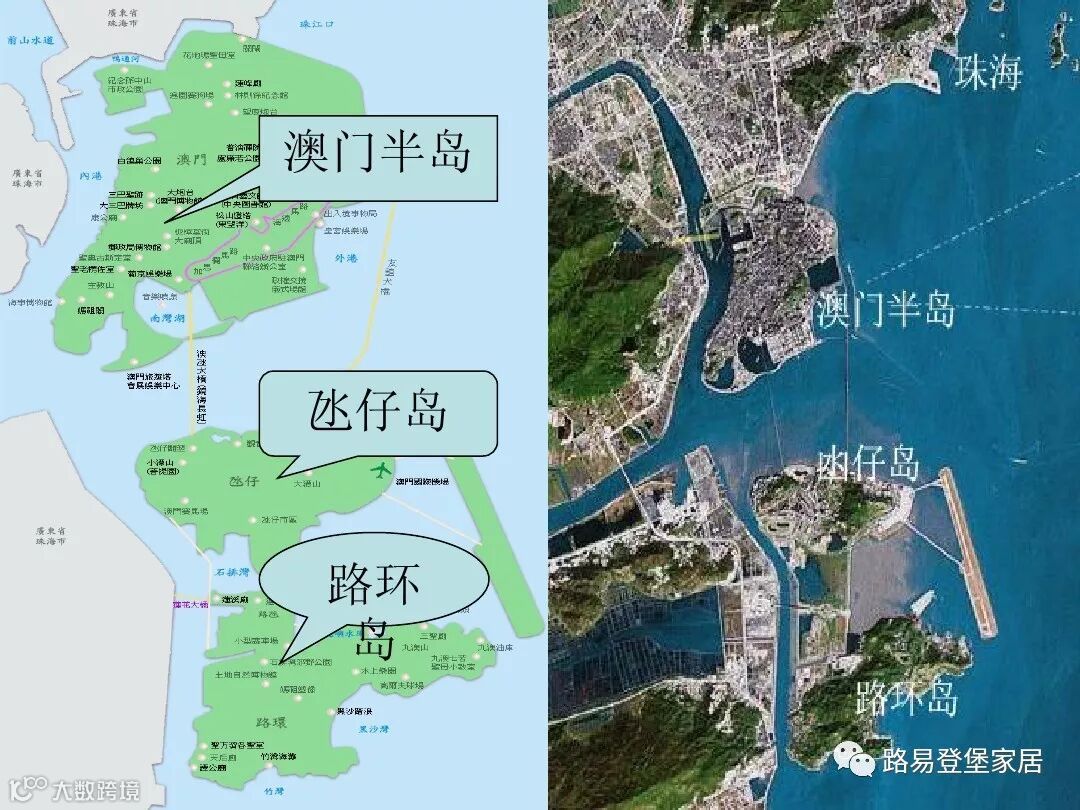 澳门,位于大陆东南沿海,地处珠江三角洲的西岸,毗邻广东省。面积约32.8平方公里。包括澳门半岛,氹仔岛和路环岛。