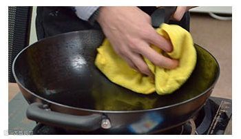 第四步,往锅内倒入些许食用油,均匀涂抹在锅体内壁,放置3—5小时后用水洗净、烘干。即可完成新锅开锅。