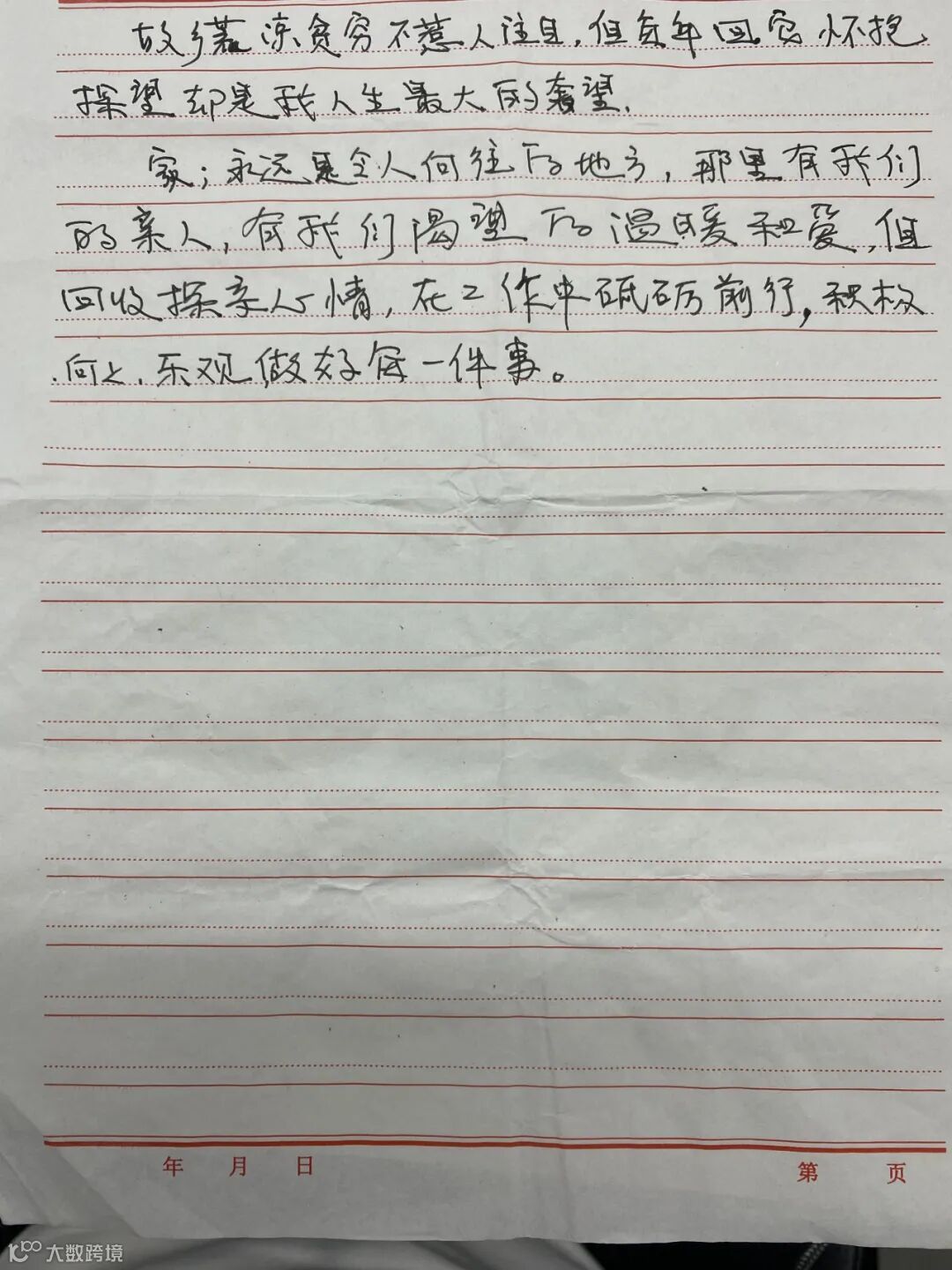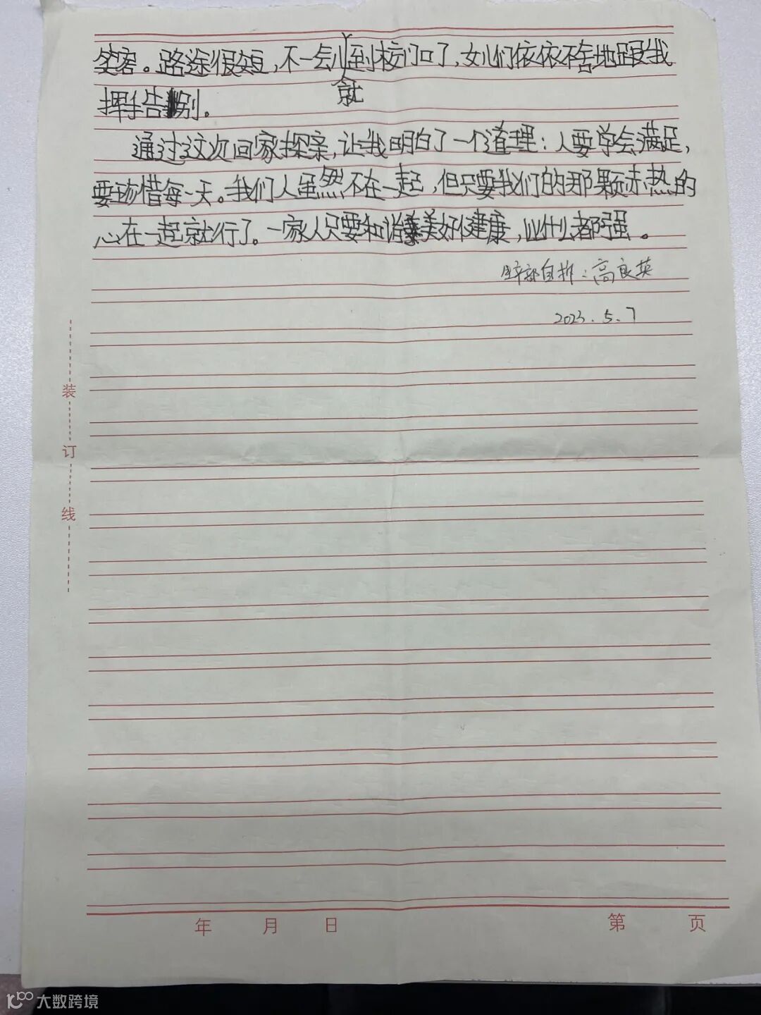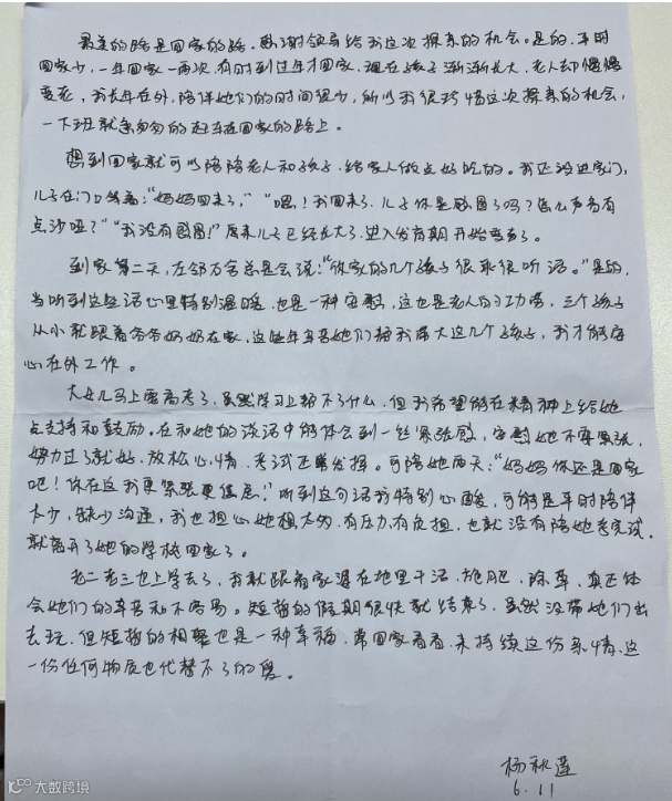 当我听到这个月有探亲假的时候,我内心是充满欢喜的,同时又多了一份期待,期待着回到家的那一刻。回家的路上,下起了大雨,这样的天气,没有影响到我愉悦的心情。反而在幻想着回到家的那一幕情景。想着想着,我便睡了过去,等我醒来的那一刻,已经到达了家乡。我回到家了,站在家门前,按响了门铃,门开了,随之而来的是一声“妈妈!你回来啦!”我看到孩子的那一刻别提多开心了,他们拥抱着我,孩子们又长高了,听着他们左一句右一句的说着他们自己发生过的趣事,听着他们分享着在学校的乐趣,我眼里都是欣慰。再看到父母,父母言语总是不多,只有一句“回来啦”,可是他们眼里流露出对我的感情却胜过千言万语。一家人聚在一起的时光总是美好的。我很享受这样的时光。虽然短暂,但是幸福莫过于厨房有烟火,而家也有温度,世界很大,幸福很小,有你们很温暖,一想到能和家人们共度余生,我对生活就充满期待。因为有了牵挂,亲情就多了一份温馨。因为有了他们,我才有前进的动力,因为有了家人,不管身处多远,家,永远都是我们的避风港。