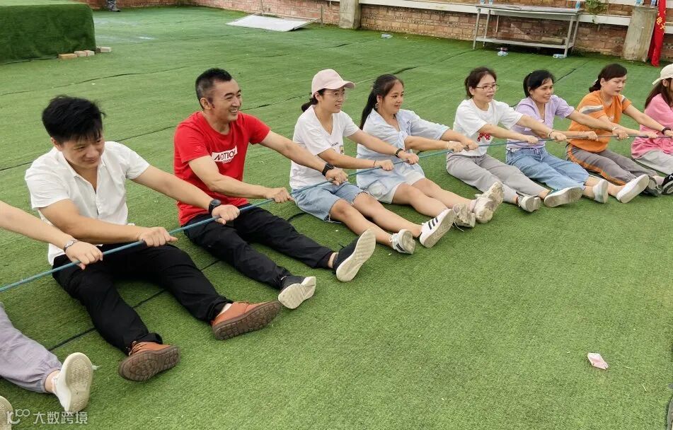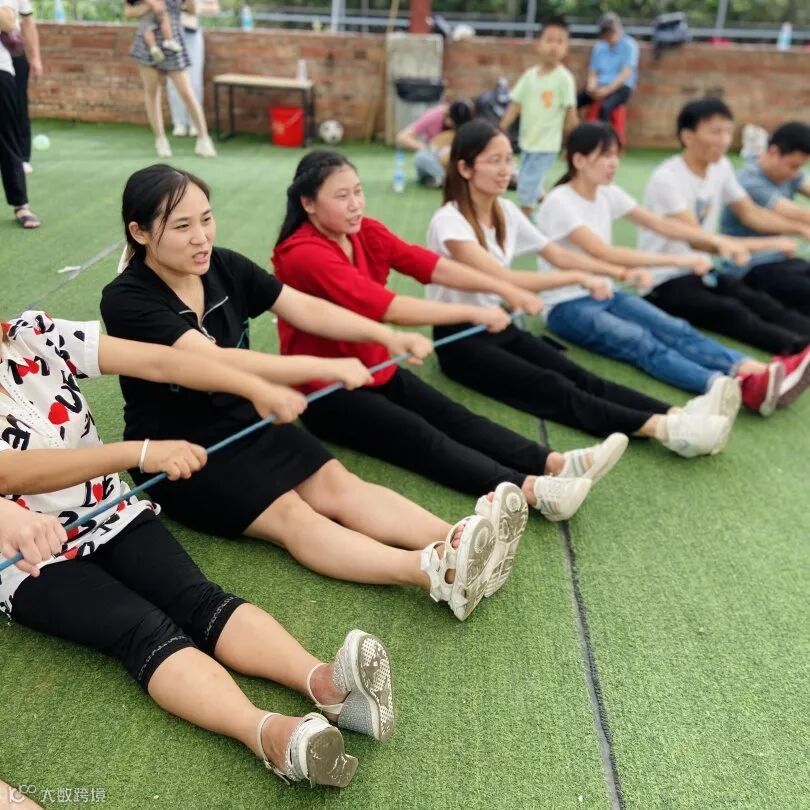 拔河绳头尾相接,组成富有张力的大圆,把所有家人链接在一起,挑战自我、超越自我!