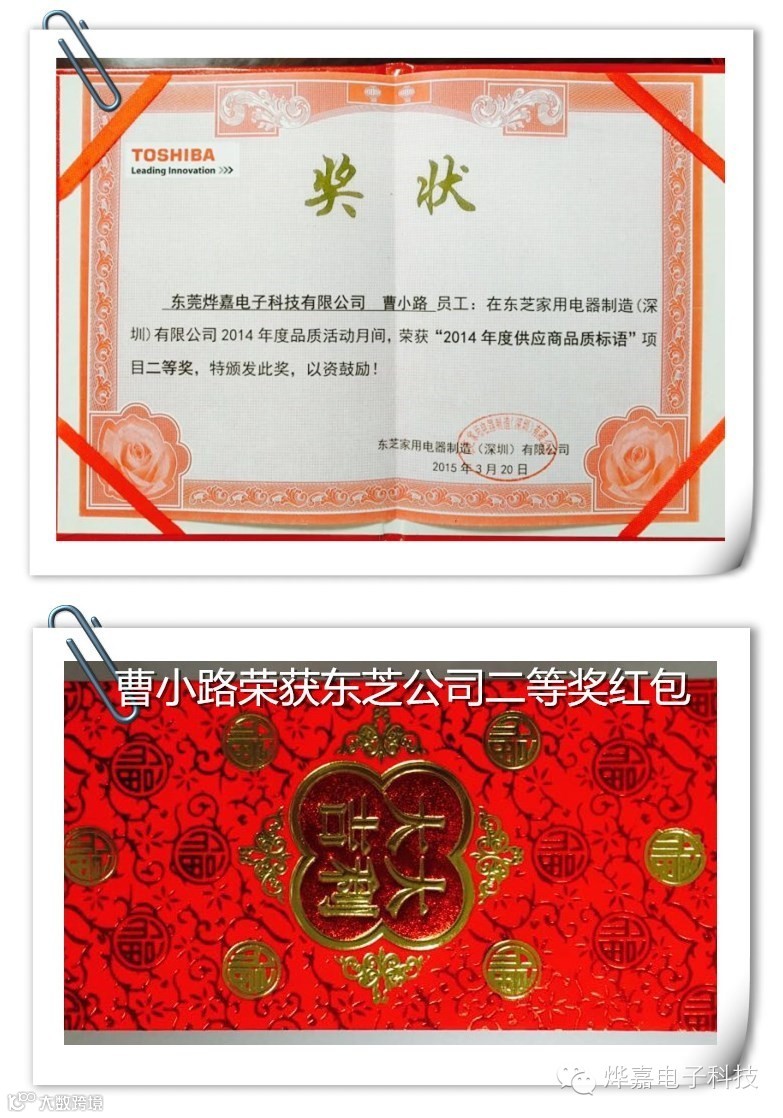 6、特别表彰品管部曹小路荣获【2014年供应商品质标语项目二等奖】