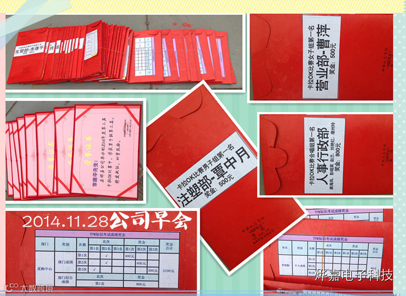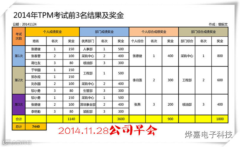 B:TPM考试结果个人和部门优秀人员颁奖,特别值得表扬的是采购中心,个人和部门综合成绩奖项最多,合计奖金高达2000多元。