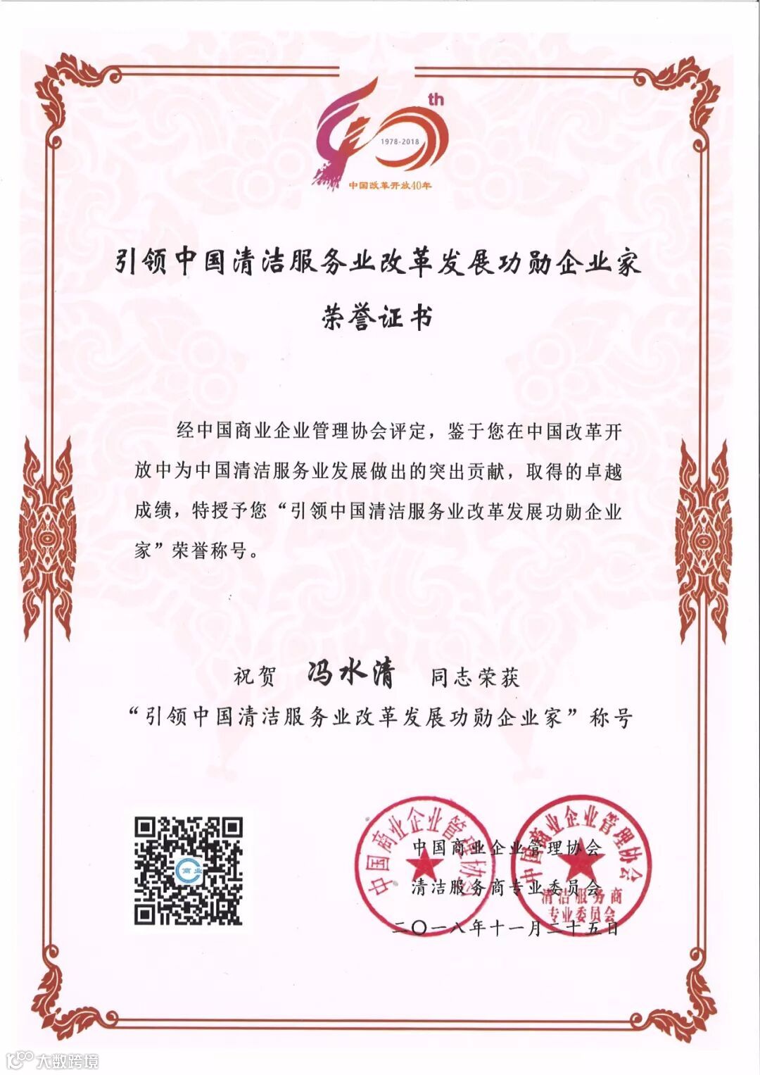2018年11月24日,中国商业企业管理协会举办的第二届全国清洁行业职能竞赛和“引领中国清洁服务行业改革发展功勋企业家”表彰大会在杭州召开。我司董事长冯水清先生荣膺“引领中国清洁服务行业改革发展功勋企业家”奖项。