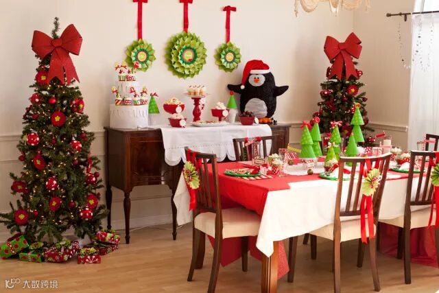 加一点绿植,莓红的花环,星星吊灯,都给就餐环境 多了一些热烈温暖的氛围。