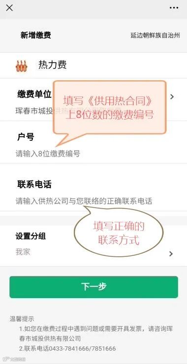 3、输入《供用热合同》中8位数的缴费编号与您的联系方式,点击下一步进行缴费操作。