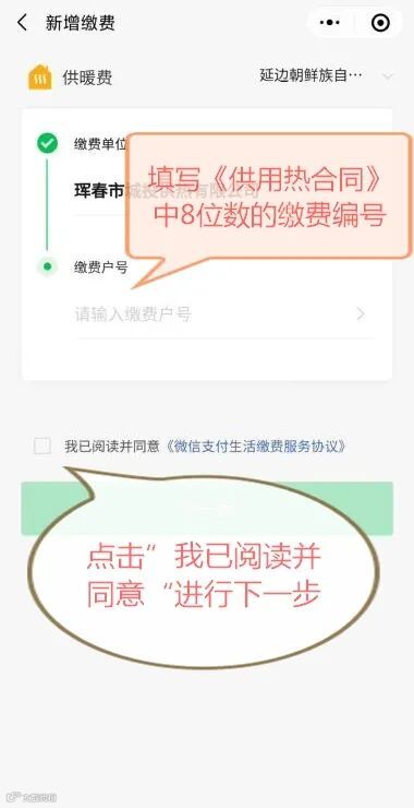 4.输入《供用热合同》中的8位数缴费编号,勾选“我已阅读并同意”,点击下一步进行缴费操作。