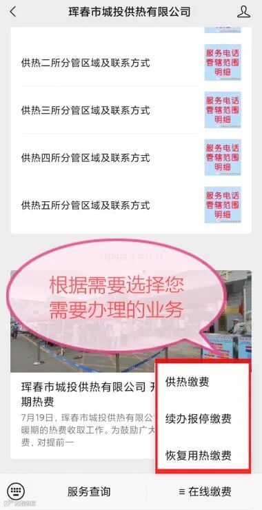 注:新办停止用热缴费业务(新办报停)用户办理缴费业务须到供热收费大厅现场办理。