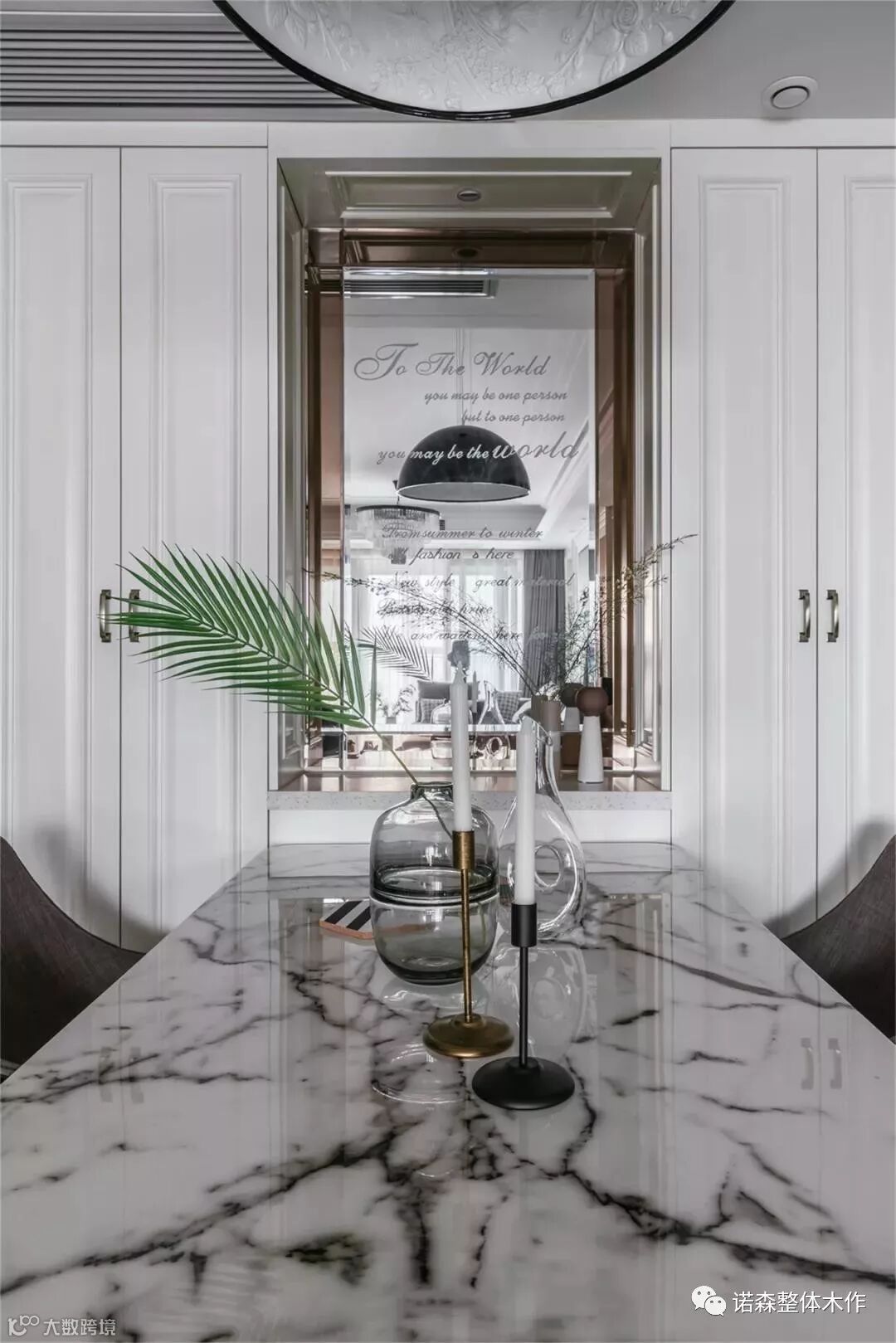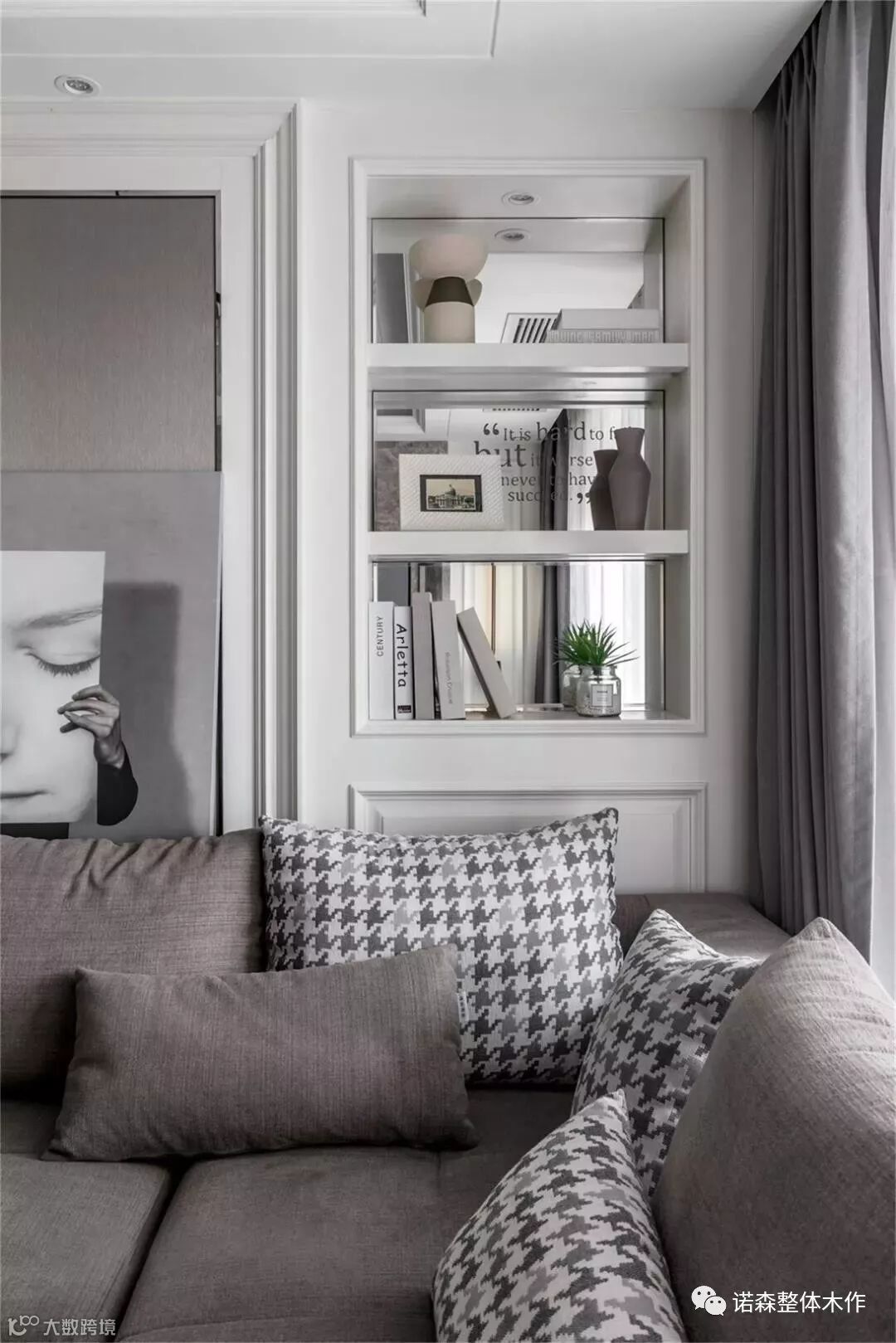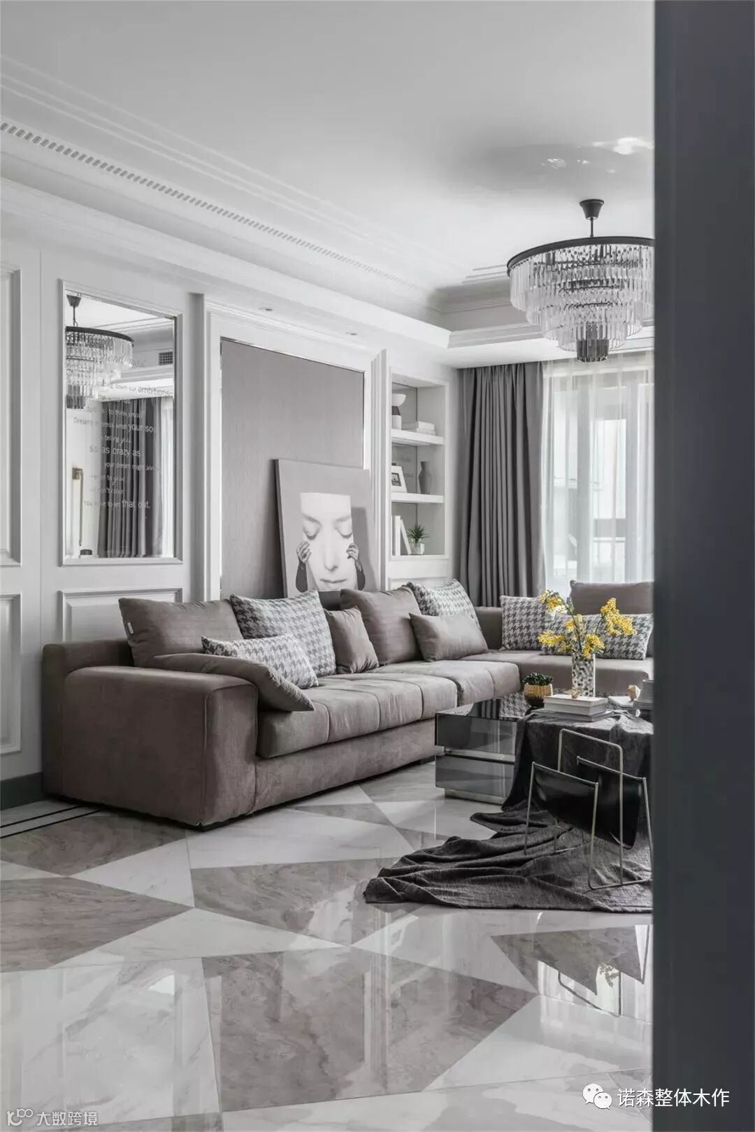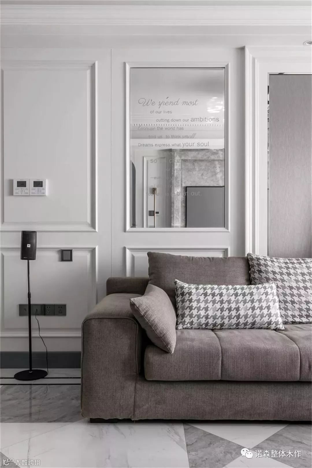 ◆ 沙发背景的一侧采用定制的车边镜面装饰,拓展客厅空间层次,活跃空间氛围,我们也精心设计了英文字母暗纹,让单调的镜面,丰富了古典的韵味。