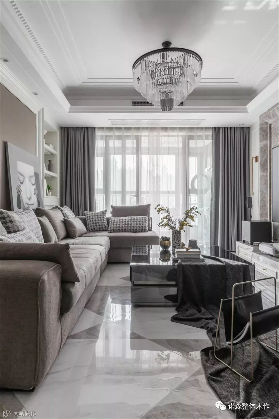 ◆客厅吊灯我们选用晶莹剔透的水晶吊灯,整体沉稳的风格中透着轻盈感,无形中提升了客厅的古典气质。