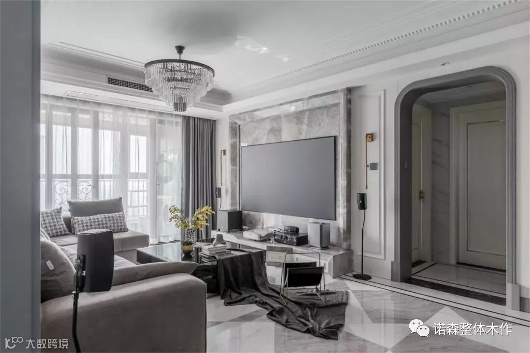 ◆ 客厅有三个过厅,拱形门洞的造型加上高柱脚,电视背景这侧的与对面的正好是中轴对称的布置形式,三个拱形门洞瞬间提升了空间的高贵典雅的气质。
