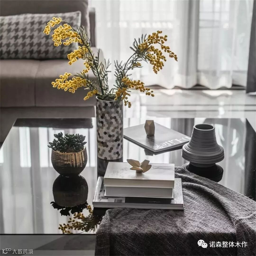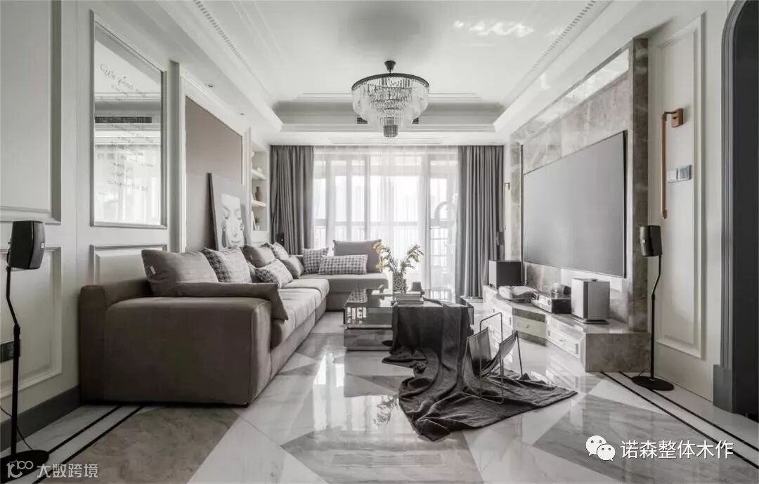 ◆ 客厅地面地砖,选用了两种颜色纹理进行拼接铺设,设计了钻石切割的铺贴方案,高贵的材质感,体现摩登时尚的生活品质,即使家居生活中不铺地毯,也是让人赏心悦目的。