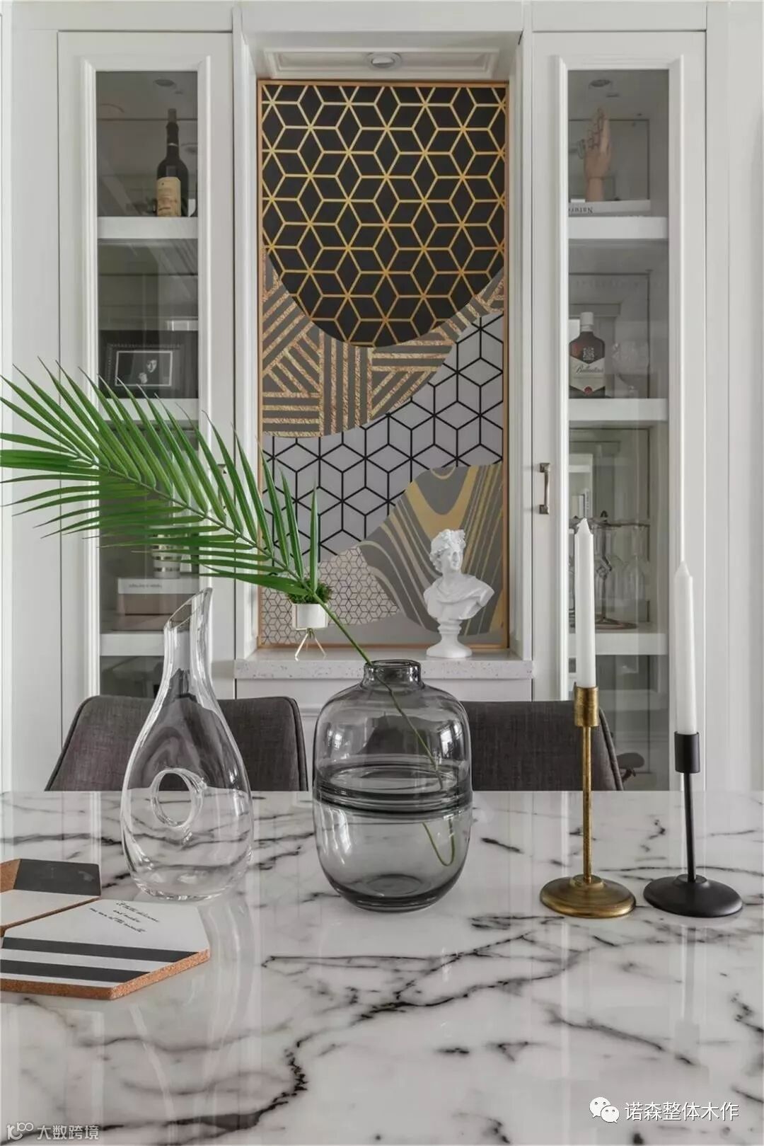 ◆ 餐边柜背景我们使用了一幅轻奢质感的装饰画,色系集合整个空间的各个配色,两侧设计了展示橱柜,业主收藏的红酒可以在酒柜中开放展示,实用美观。