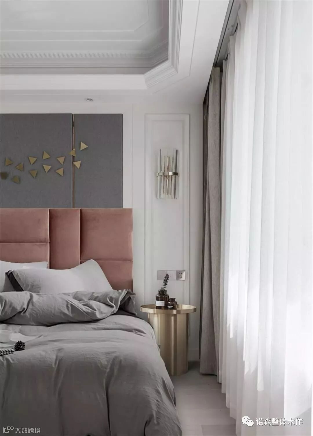 ◆ 背景墙中间部分运用硬包并镶嵌香槟色金属条,营造现代轻奢质感,两侧白色叠级护墙板并搭配装饰壁灯;床头柜我们选用了两款样式 ,方圆结合。