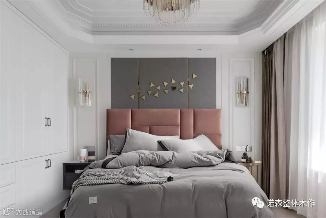 ◆ 主卧的设计,延续了客餐厅简约的层次和色调,吊顶丰富而精致,与墙面简欧护墙互相呼应,提升了空间的整体饱满度,融合了高级灰的质感,水晶与金属材质搭配的吊灯,繁复而又精致。