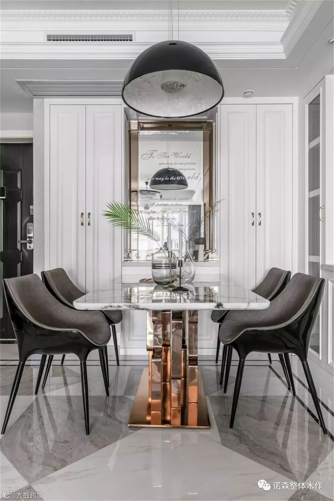 ◆ 餐桌我们选用了六人位的长桌,桌面是白色纹理显著的大理石,基座是古铜色金属质地,凸显现代轻奢感。