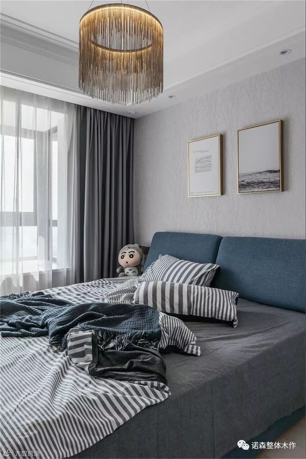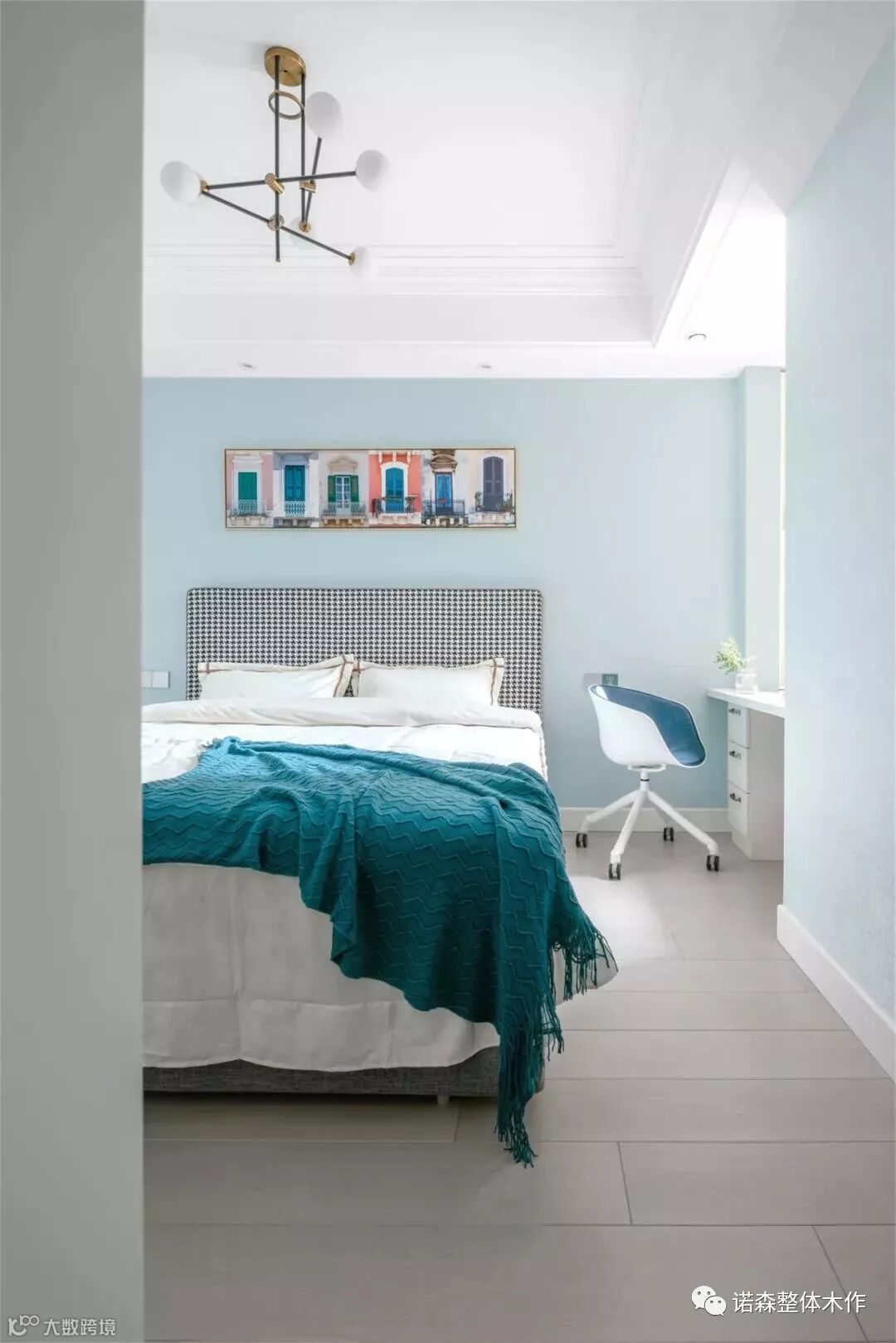 ◆ 北次卧作为以后的儿童房,我们运用了明亮的淡蓝色调,灯具点缀了黑色金属元素,千鸟格布纹的床背靠,经典又时尚,装饰画则跳跃了对比色,让整个空间都活泼起来。