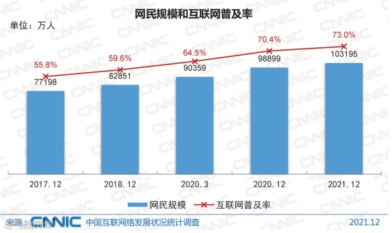 中国互联网络信息中心发布《中国互联网络发展状况统计报告》指出,截至 2021 年 12 月,我国网民规模达 10.32 亿,较 2020 年 12 月增长 4296 万,互联网普及率达 73.0%,较 2020 年 12 月提升 2.6 个百分点。