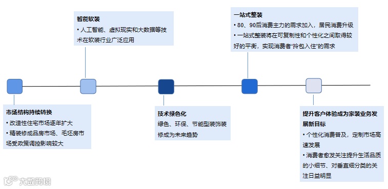 前瞻产业研究院提出,未来中国家装行业发展趋势(如下图所示)将会继续朝绿色环保、一站式整装方向发展,提升客户体验仍将成为家装业务发展的新目标。