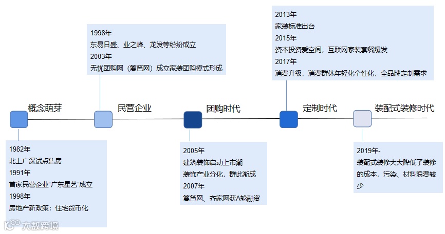 发展至今,随着市场环境的变革、互联网技术在产业内的应用,家装企业的存在形式不断转型,中国家装行业的发展历程可概括为以下五个阶段。