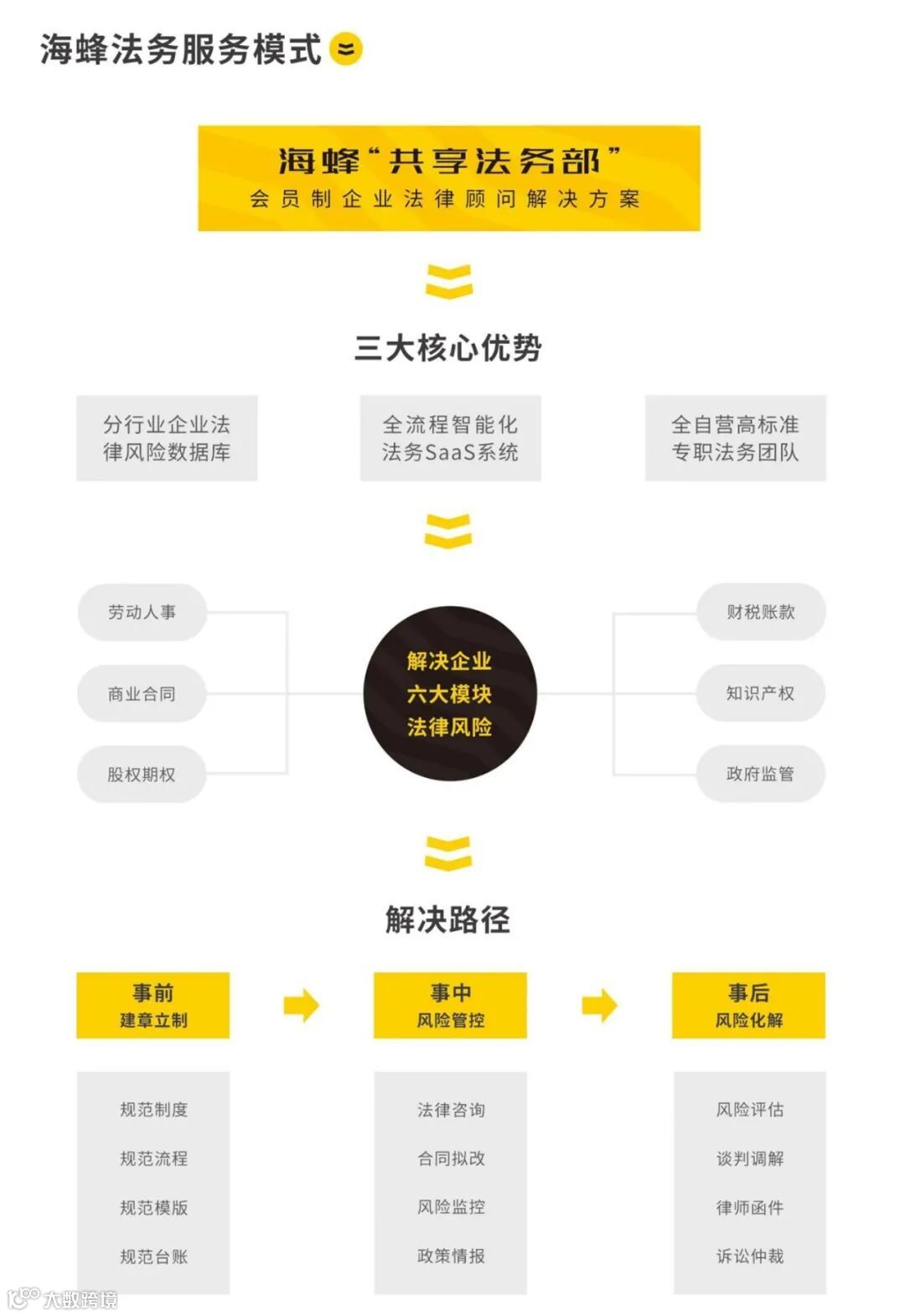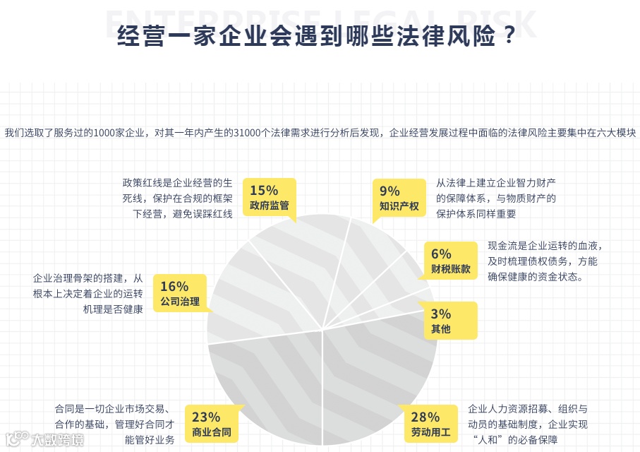 依托于强大的科技+法律背景,构建了强大的分行业法律风险数据库、全流程智能法务SaaS系统和自营化专职法律风险防控化解团队,独创「共享法务部」模式,为百万中国好企业,法律防控保驾护航。在商业合同、劳动用工、财务税务、政府监管、知识产权和股权期权等问题,为企业会员进行全生命周期法律风险化解与防控。