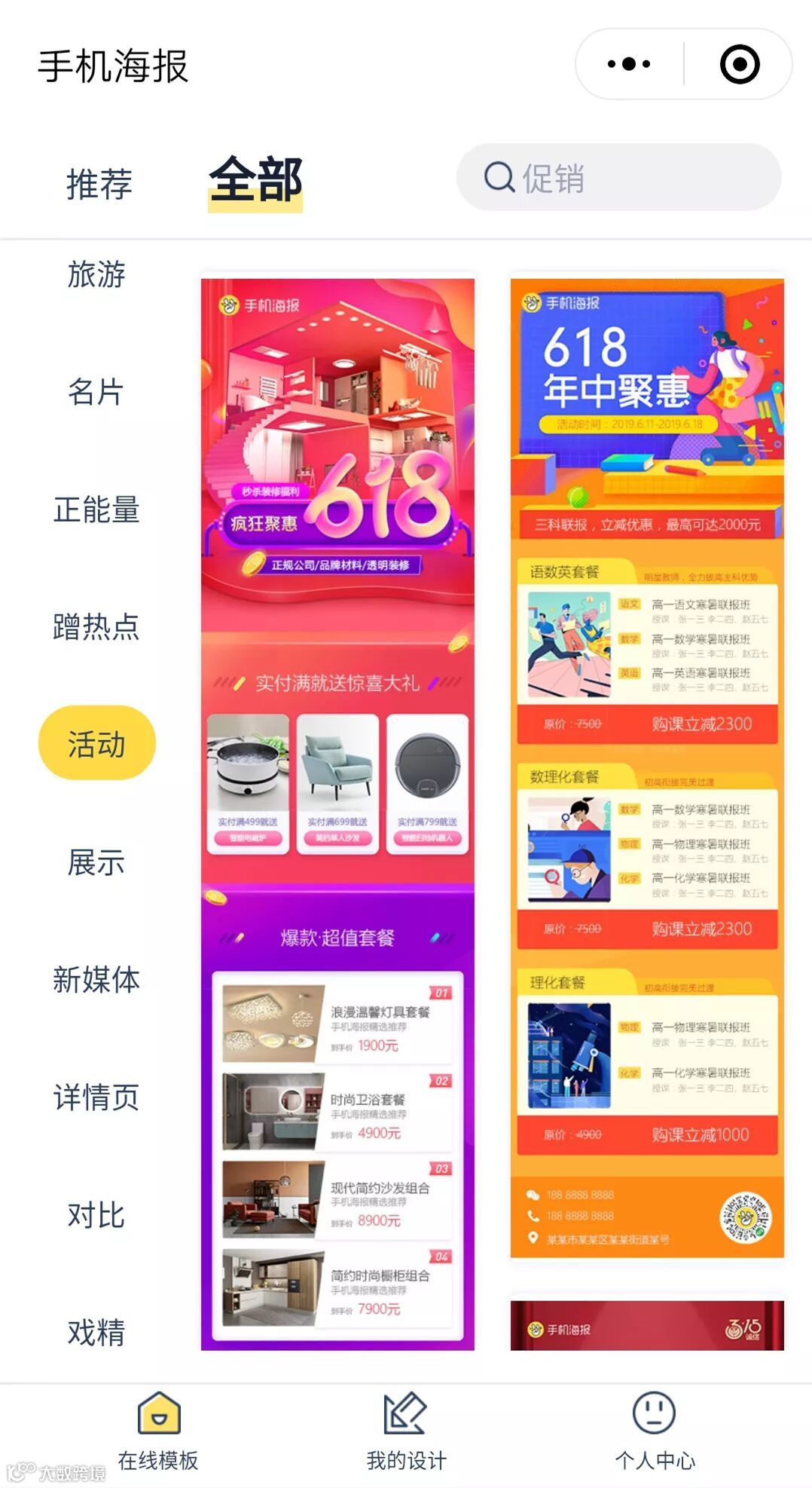 手机海报微信小程序软件也是助力保驾护航营销推广的利器之一。根据用户的不同需求,手机海报微信小程序设招商、热点、活动推广、签单展示、新媒体推广等栏目,用户只需动动手指就能在已有的创意版式基础上,做出属于自己的推广海报。