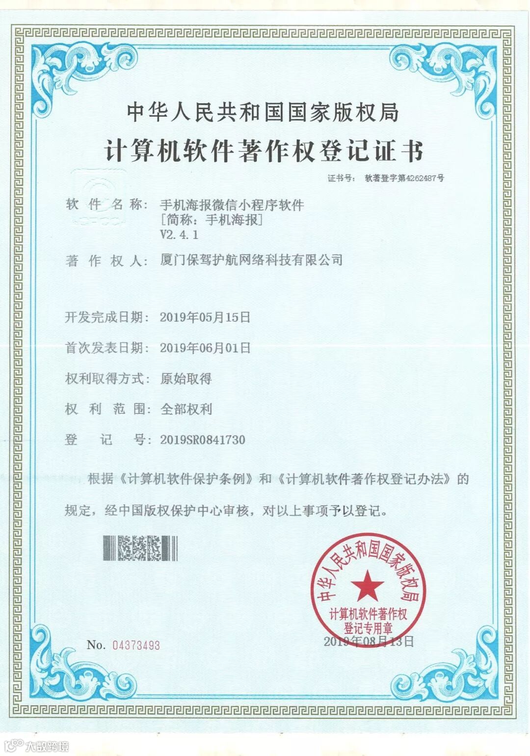 保驾护航自主研发的“保驾营销通”、“手机海报微信小程序软件”,经过中国版权保护中心审核,顺利获得计算机软件著作权登记证书!