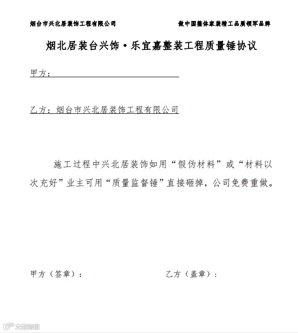 2、签订协议,法律保障。只要是在我们公司装修设计的业主,我们都会和业主签订“工程质量锤协议”,保障施工品质达标。