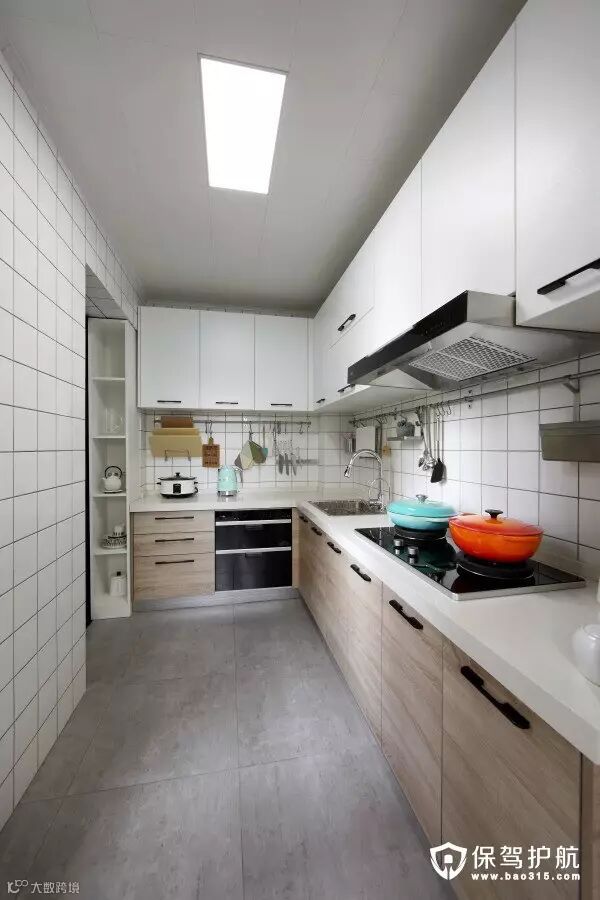 ▲餐吧台中厨图片太少,因为基本只有这一个角度可拍。墙上横杆购自宜家,搭配了挂勾,筷子桶,沥水架,调料篮,锅盖架等配件,超级实用~最左侧的窄高柜是木工大叔自行设计的,代替了砖砌门垛,增加了展示收纳空间,超级有才有木有!