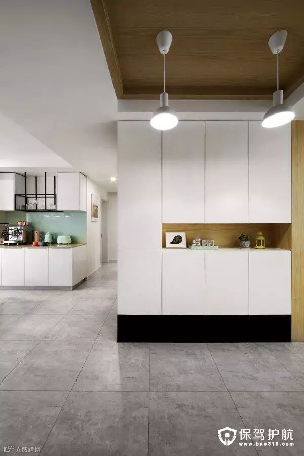 ▲玄关装了一个顶天立地的大柜子,收纳空间很足。柜门没装拉手,内部安装了反弹器,从外面看上去很简洁,家里很多柜子都是这种设计。玄关的吊顶是木质吊顶,木工板打底,表面贴了原木饰面板。
