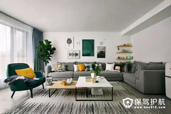 ▲客厅没有装主灯,在房间四周和正中共安装10盏筒灯,电视柜上方凹槽处安装灯带,不过图片p过头了,看不到筒灯了,请大家自行想象,哈哈~超爱这把墨绿扶手椅,为它特意搭配了墙上的大D海报。