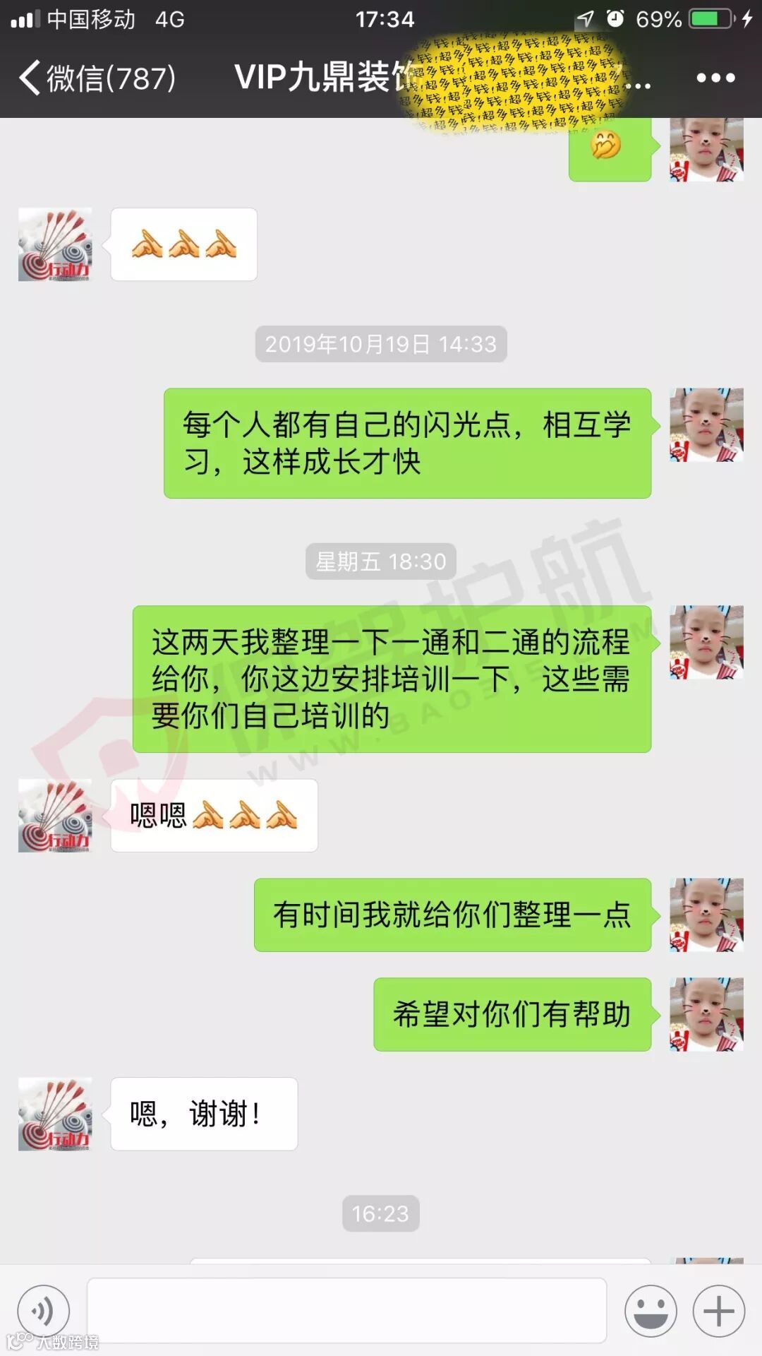 4.金管家服务:九鼎装饰会为业主指派一名专业监理人员,提供一对一保姆式金管家服务。从开工前到开工仪式,一直到竣工,监理人员会每天将施工过程中的(水,电,木,瓦,油)每一个环节情况通过专门的微信服务群,与业主进行沟通联系。如有问题,业主只需要联系监理人员即可,监理会协调解决业主的疑问和困难。