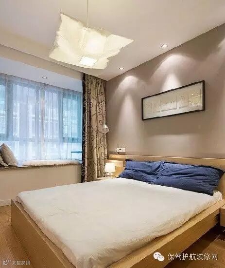 简洁的卧室,木质的原木色大床,白色的杯子加上蓝色的枕头,清清爽爽,非常舒服。乍一看有一种日式的感觉。