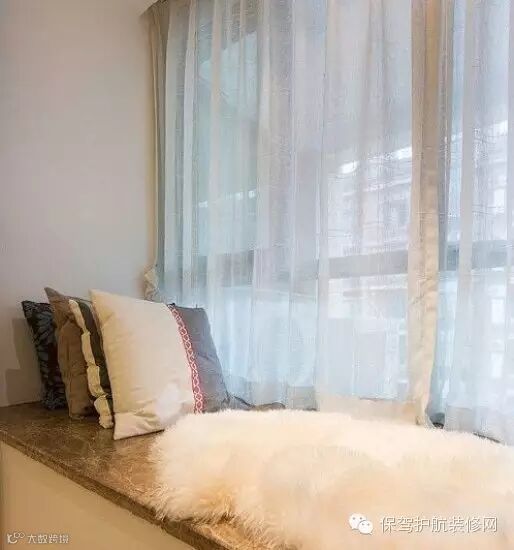 卧室里的飘窗,上面摆放了几个颜色不一的抱枕,白色的沙曼窗帘和毛毯,看上去很暖和也很浪漫。