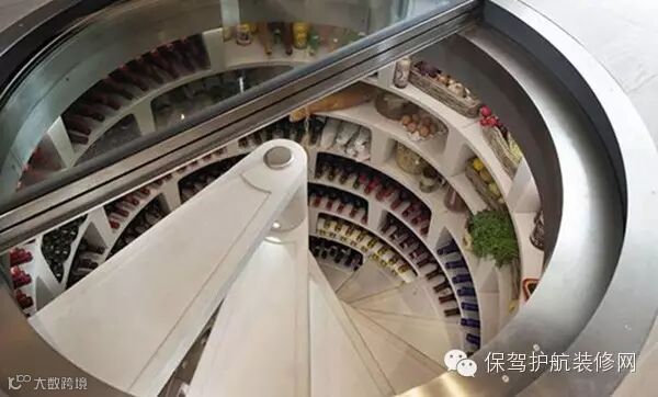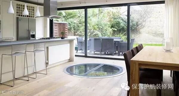 细看圆形玻璃才知道,原来底下是一个酒窖,收藏了好多食物和酒,把酒窖上方设计成厨房的地板,这样的创意也是令人脑洞大开。