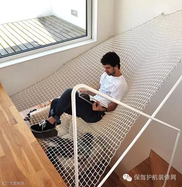原来小小的楼梯间还可以这么设计,吊床和楼梯间的组合,加上一个宽敞的窗户,堪称完美。