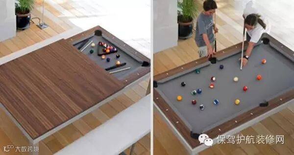 饭后休闲的时候来一局,怎么样?这样一个多功能餐桌设计,也是非常不错的,盖上木板,就是一张饭桌,推开木板它就成了台球桌了。